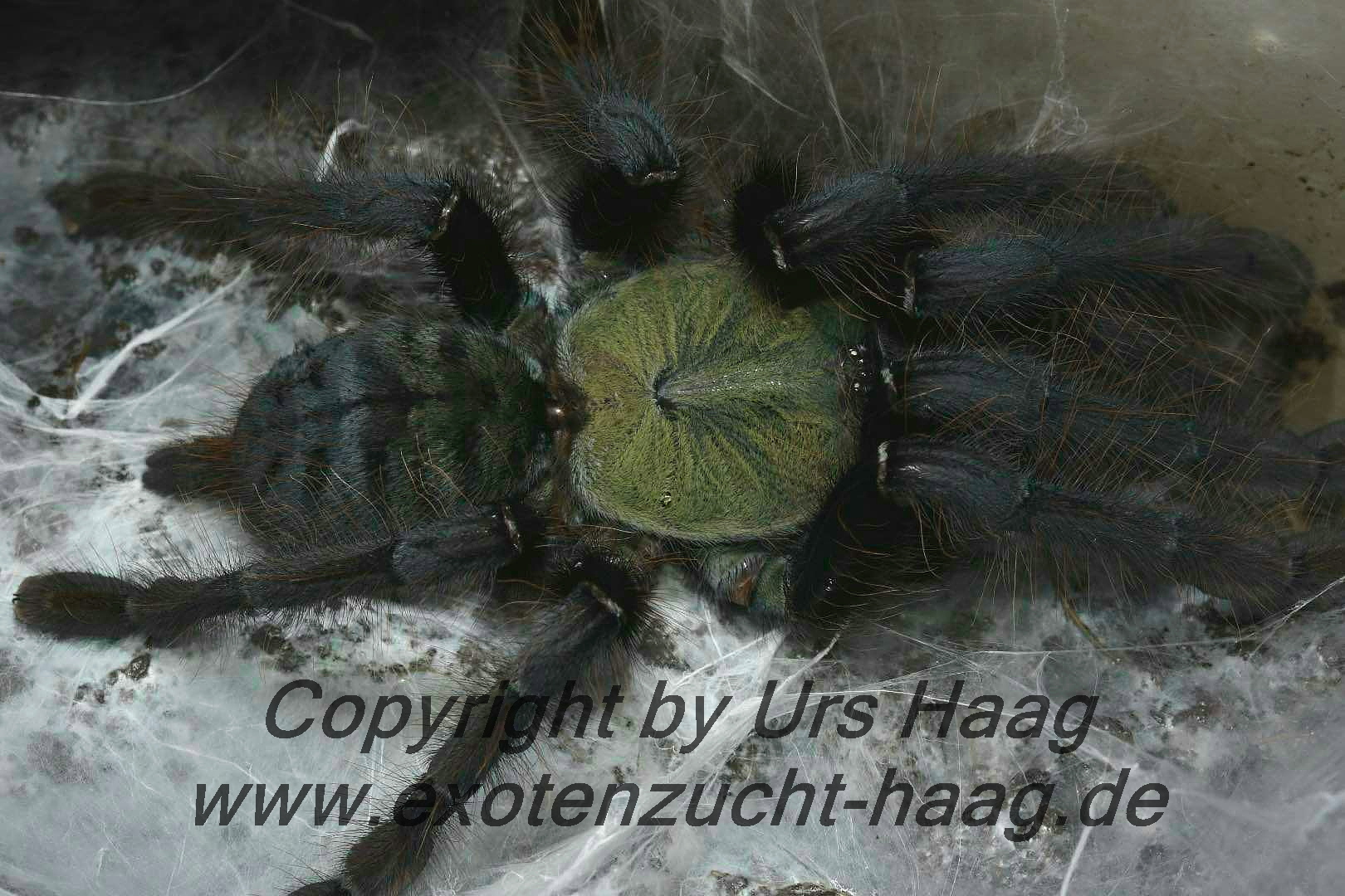 Die Tiere werden mit ca. 7 cm recht groß. Charakteristisch für die Art ist der dunkelgrüne Carapax bei adulten Weibchen. Bis zum subadulten Stadium ist der Carapax eher gelblichgrün und deutlich heller. Wir freuen uns einige Nachzuchten dieser noch sehr seltenen Art bekommen zu haben.