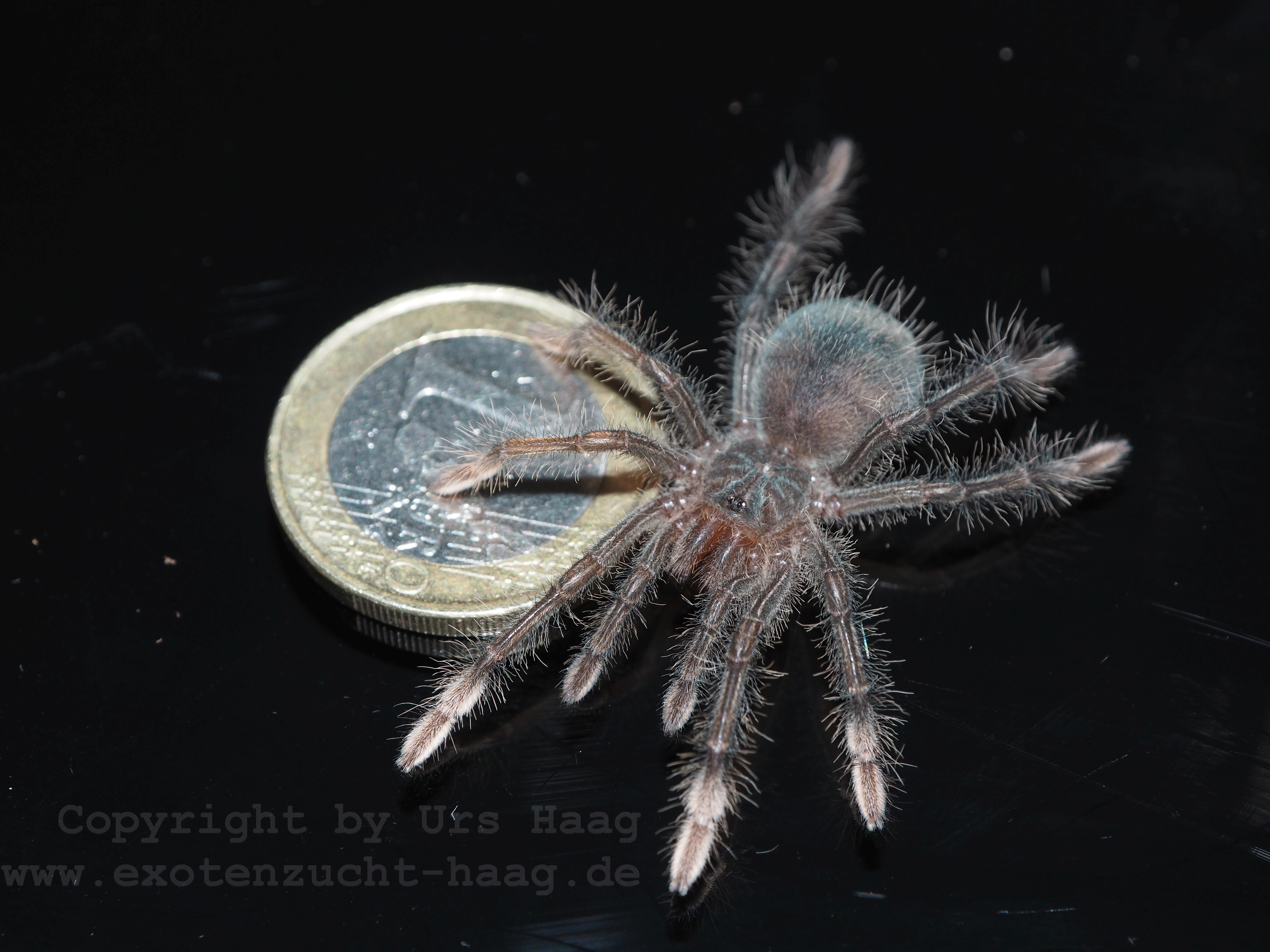 Mit einer erreichbaren Beinspannweite von weit über 20 cm und einer Körperlänge von 12 cm, die wohl größte Vogelspinnenart der Welt. Meiner Erfahrung nach werden die Tiere noch etwas größer als Theraphoosa blondi.